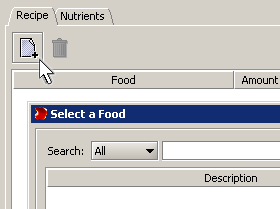 This causes the "Select a Food" panel to display. You can now type the name of the first food ingredient for your recipe. Select the ingredient by clicking on it, enter a weight, and click the "ADD" button. Repeat the procedure for each ingredient. In the recipe, you can adjust the amount of each ingredient by double clicking the amount field and typing a new value. Similarly, by double clicking the calories, you can type a new number and the weight will be adjusted accordingly. Foods may be removed from the recipe by clicking on them and then clicking on the trash can icon.
